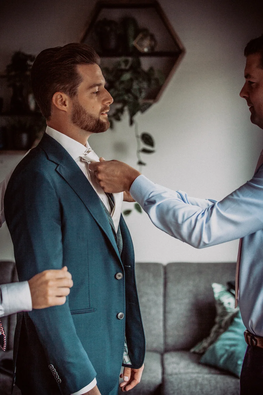 Tijdens het aankleden ben ik observerend bezig. Zo nu en dan vraag ik iemand om een jas nog een keer uit en aan te doen of een stropdas recht te trekken. Ik vraag vrienden of familie te helpen met de stropdas goed doen om wat extra mooie momenten te schieten. Ik probeer vooral alles vloeiend te laten lopen. Het moet namelijk geen photoshoot dag worden, maar een registratie van de mooiste dag van je leven.